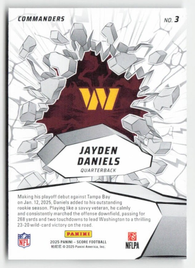 You are purchasing a 2025 Score Jayden Daniels #3 Emerged. You will receive the exact item in the photographs. Thank you for looking.