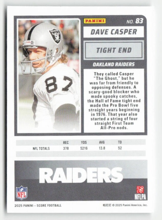 You are purchasing a 2025 Score Dave Casper #83. You will receive the exact item in the photographs. Thank you for looking.