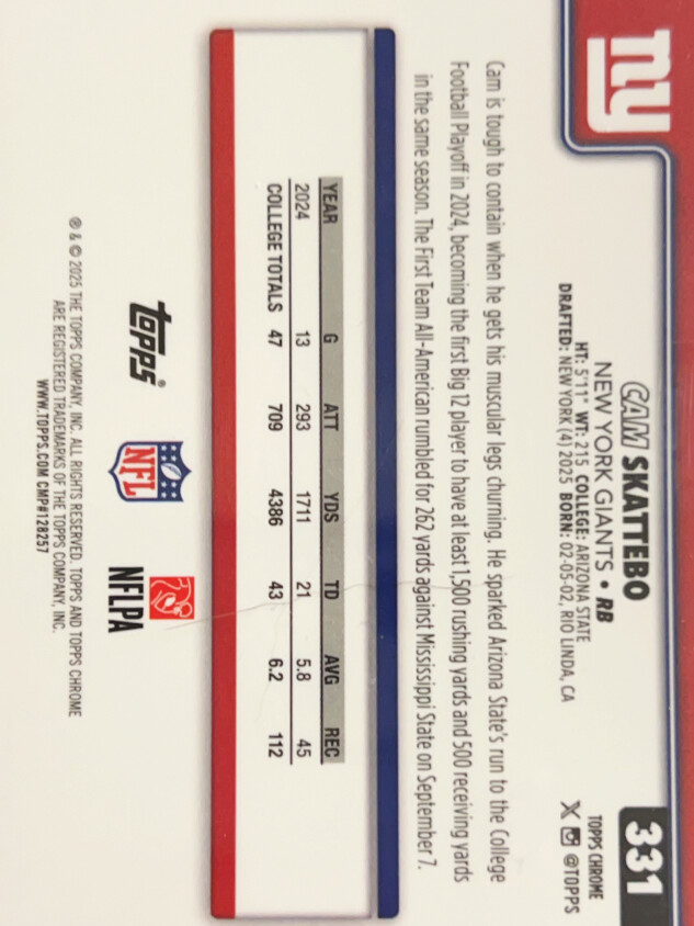 You are purchasing a 2025 Topps Chrome Cam Skattebo #331 RC. You will receive the exact item in the photographs. Thank you for looking.