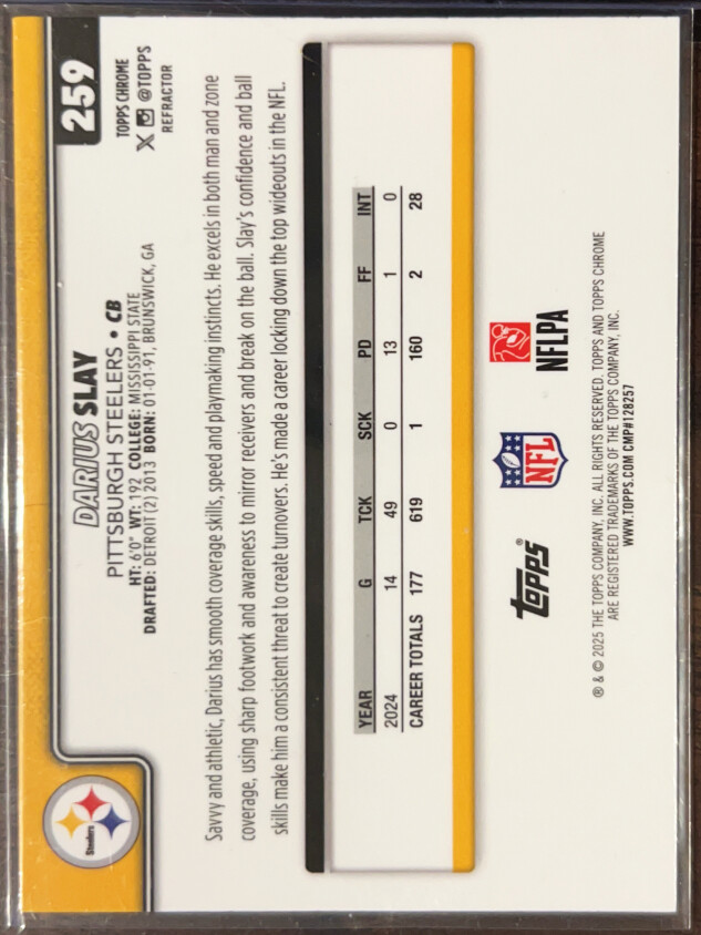 You are purchasing a 2025 Topps Chrome Darius Slay #259 Refractor. You will receive the exact item in the photographs. Thank you for looking.