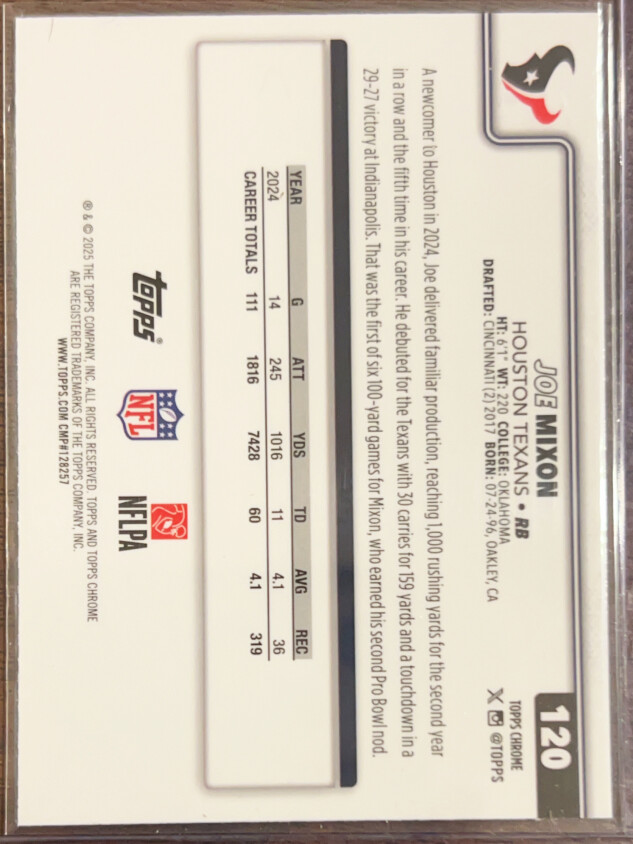 You are purchasing a 2025 Topps Chrome Joe Mixon #120 RayWave. You will receive the exact item in the photographs. Thank you for looking.