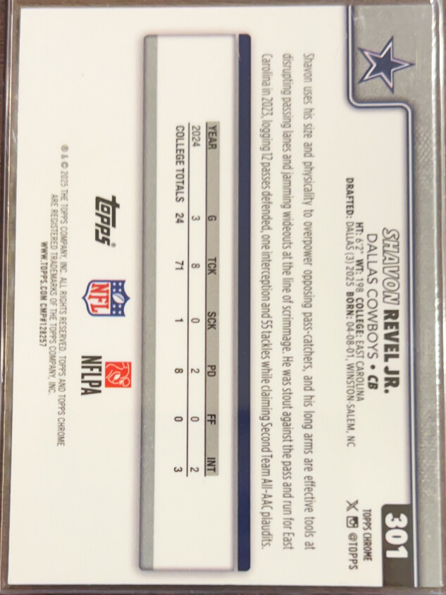 You are purchasing a 2025 Topps Chrome Shavon Revel Jr. #301 RC. You will receive the exact item in the photographs. Thank you for looking.