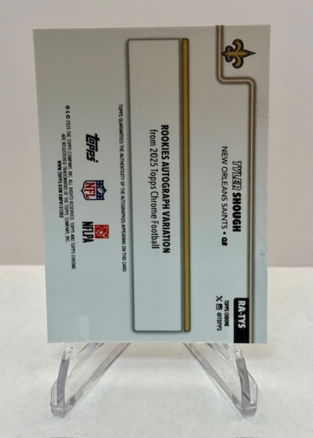 Check out the 2025 Topps Chrome Tyler Shough Purple Parallel with on card Autograph #/75. This is a premium parallel version of Tyler Shough's 2025 Topps Chrome autograph card, limited to just 75 copies. The vibrant purple refractor finish delivers eye-catching appeal with its distinctive chrome technology that Topps Chrome is known for. Each card is hand-signed by Shough, making it a genuine autographed collectible perfect for fans and serious collectors alike. The low print run of 75 makes this a scarce find in the secondary market. Whether you're building a Tyler Shough collection, pursuing purple parallels, or seeking premium autographed rookies, this card combines rarity, visual appeal, and authenticity in one sought-after piece.