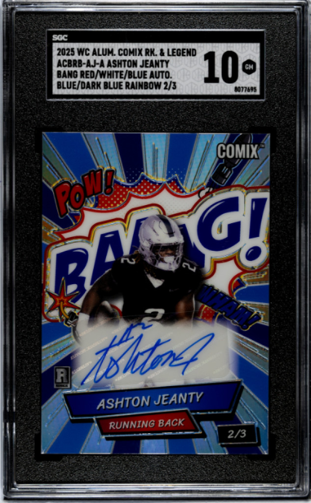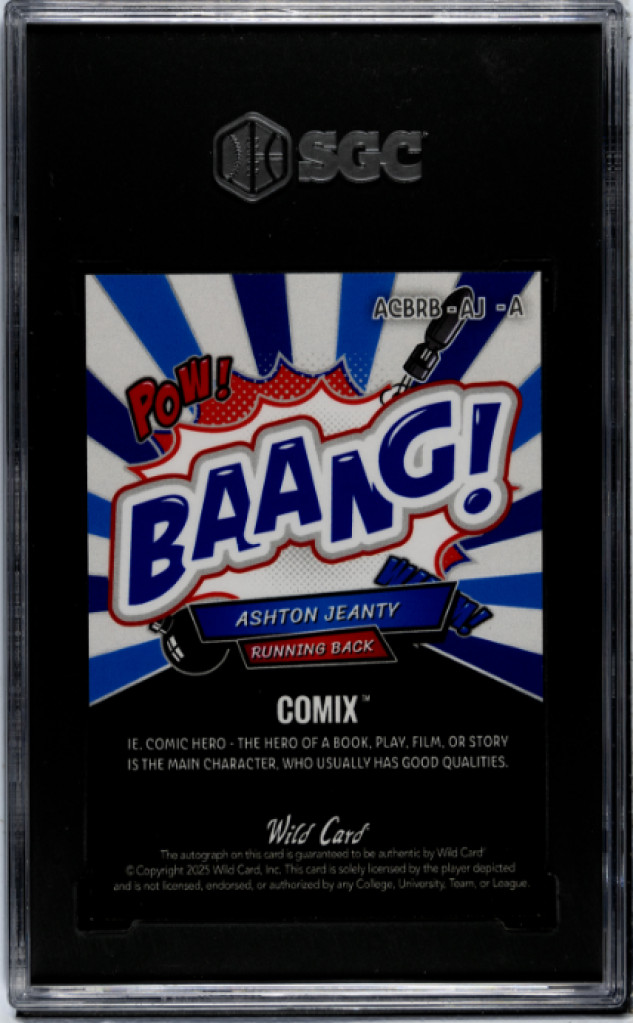 The product is a highly sought-after 2025 Wild Card Alumination Comix Rookie & Legend trading card featuring Ashton Jeanty, signed by Emmitt Smith. This card is authenticated by Leaf and graded a perfect 10 by Sportscard Guaranty Corporation (SGC). Made of sturdy 35 Pt. card stock, this standard-sized football trading card is a valuable addition for any collector, especially for fans of the National Football League (NFL) looking for a rare and unique piece from the 2025 season.