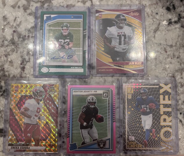 This 5 card lot features . 2025 optic Ashton Jeanty Pink RC, 2025 Donruss Abdul Carter Vortex, 2025 Absolute Jalon Walker /325, 2025 Mosaic Emeka Egbuka reactive yellow RC, 2024 Isaiah Davis rookie auto