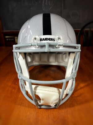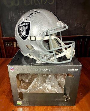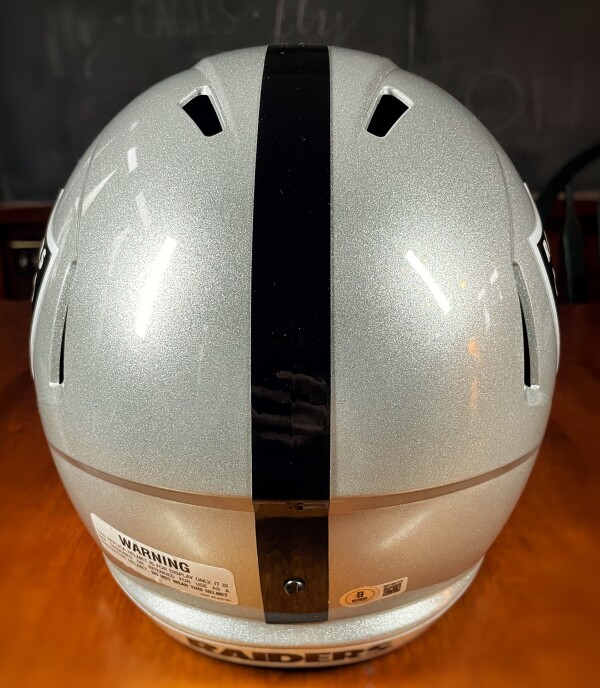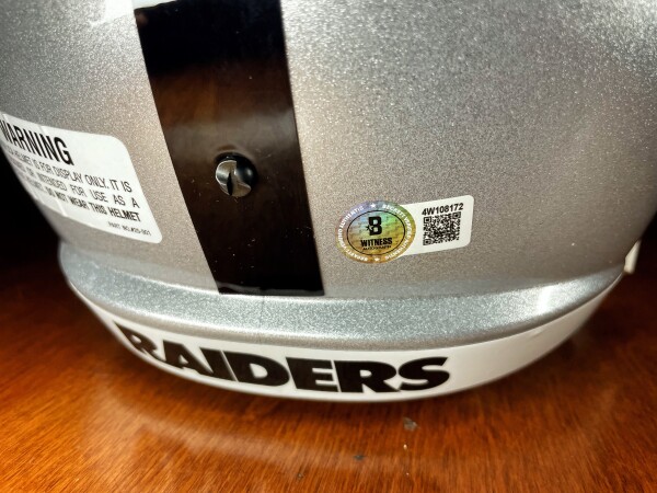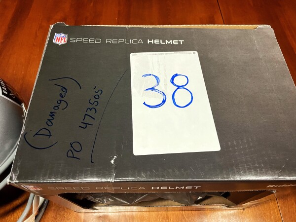 This helmet is in great condition but PLEASE NOTE that the auto does have a small smudge, as pictured. The box is not in that great of condition, but who cares about the box. It is marked as “damaged” due to the smudged autograph.