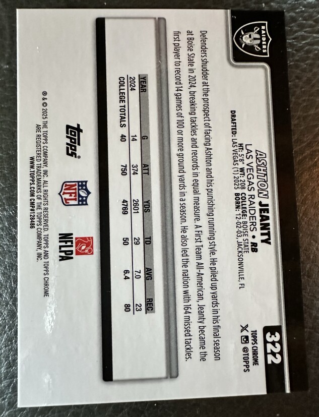 Ashton Jeanty White Topps Chrome Rookie 2025 24/30
