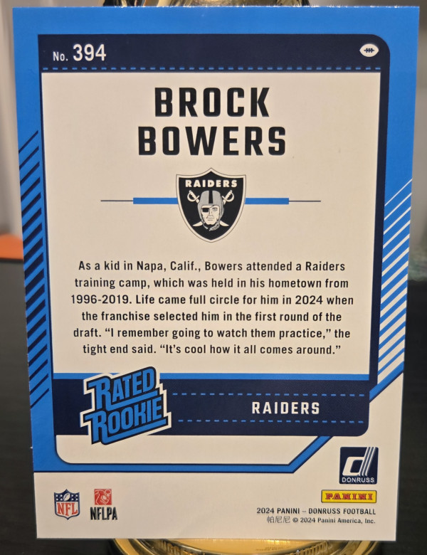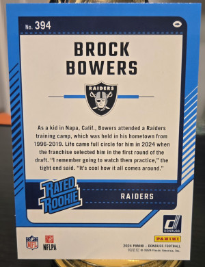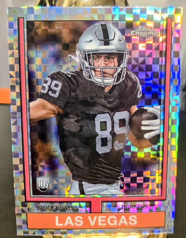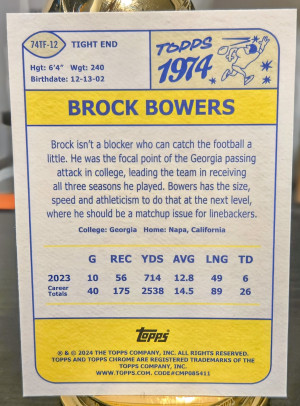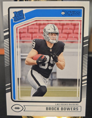 The product is a set of two sports trading cards featuring football player Brock Bowers. The cards are from the 2024 Topps Chrome 1974 X-Fractor and '24 Donruss Rated Rookie collections, manufactured by Topps. The cards are associated with the National Football League (NFL) and specifically showcase Bowers as a player for the Las Vegas Raiders in the 2024 season. These collectible cards are highly sought after by fans and collectors for their rarity and design.