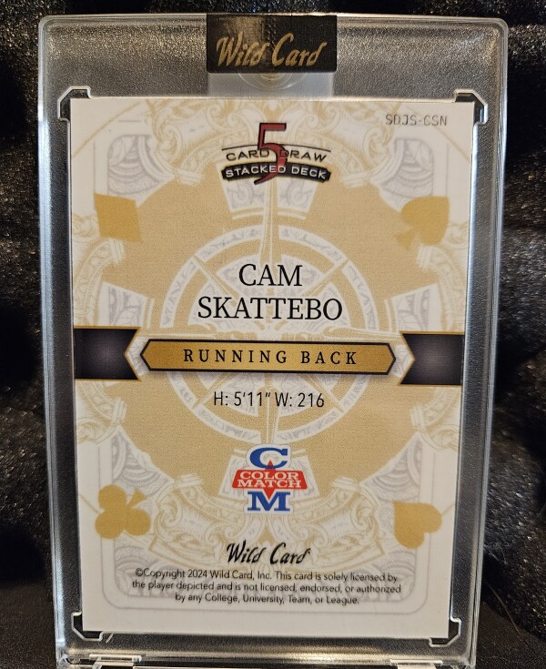 This card is a 2024 Wild Card 5 Card Draw "Stacked Deck" Cam Skattebo 1/1. As a "One of One" (1/1), it is a unique printing, meaning no other card with this specific design and foil combination exists.