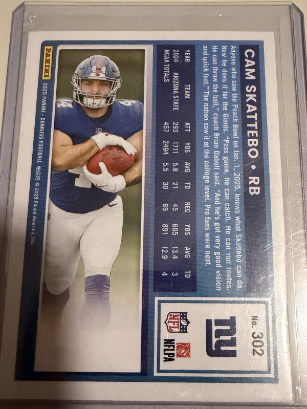 Nice looking Press Proof parallel of Cam Skattebo in his Giants uni. Great pickup for Giants fans, rookie collectors, or anyone holding RB depth upside.