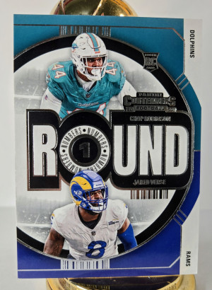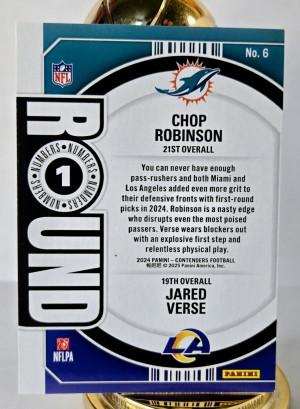 The product is a set of two football trading cards featuring Chop Robinson, a player from the Miami Dolphins, from the 2024 season. The cards are part of the '25 Resurgence Blue Orange Spark collection and are categorized as sports trading cards. These rookie cards have a special parallel and insert design, making them unique additions for collectors and fans of the National Football League (NFL).