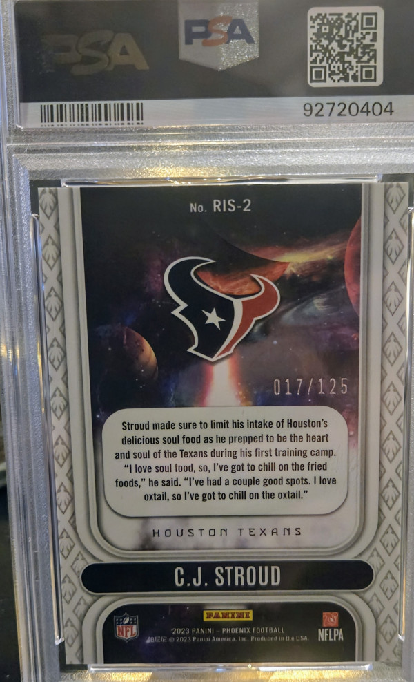 The product is a 2023 Panini Phoenix Rookie Rising trading card featuring rookie player C. J. Stroud, graded as a PSA 8. The card is part of a limited print run of only 125 copies and is in near mint or better condition. This football trading card is focused on highlighting the up-and-coming talent of C. J. Stroud in the National Football League, specifically representing the Houston Texans. The card is a valuable addition to any sports trading card collection, especially for fans of the NFL and those following the career of C. J. Stroud.