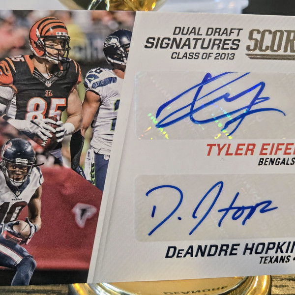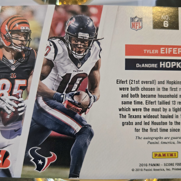 The DeAndre Hopkins/Tyler Eifert 2016 Panini Score Dual Autograph #6 is a rare and valuable sports trading card featuring dual autographs of the NFL players. The card showcases the signatures of DeAndre Hopkins from the Houston Texans and Tyler Eifert from the Cincinnati Bengals, making it a unique and special addition to any football card collection.