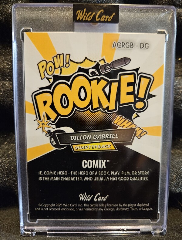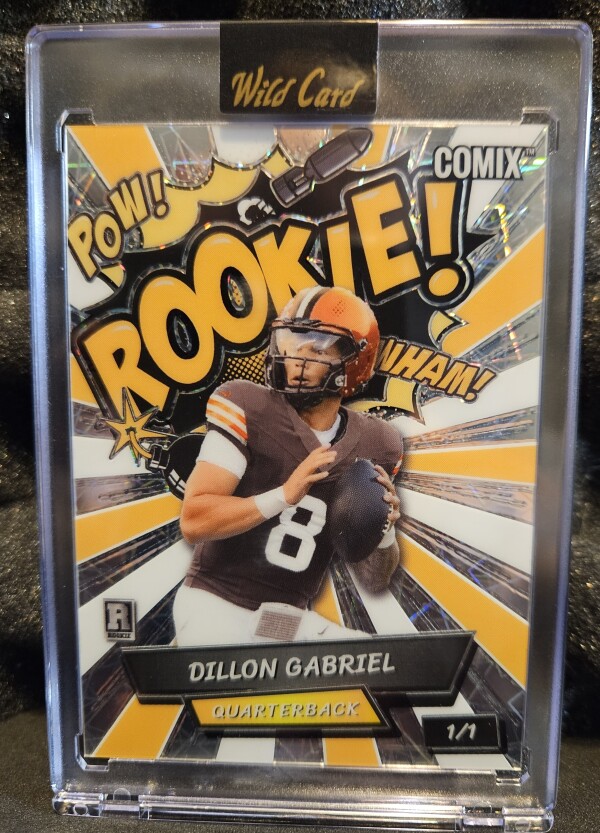 2024 Wild Card Alumination Comix "Rookie!!" 1/1 featuring quarterback Dillon Gabriel in a Cleveland Browns uniform. As a "one-of-one" (1/1) card, it is the only one of its kind produced with this specific design and serial numbering.