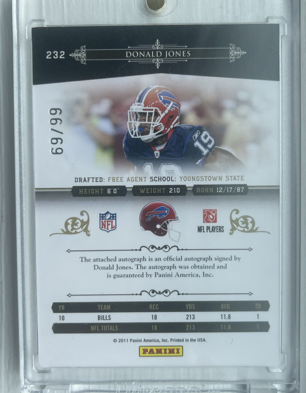 Donald Jones 2011 Panini Playoff National Treasures Rookie 69/99 Auto 232