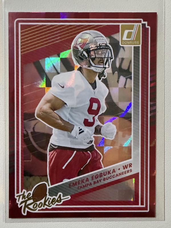 Up for grabs is a Donruss “The Rookies” Red Parallel featuring Emeka Egbuka, wide receiver for the Tampa Bay Buccaneers. Sharp red foil, clean edges, and great eye appeal — a must-have for rookie collectors and Bucs fans.
