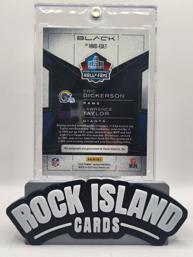 You are purchasing a Eric Dickerson Lawrence Taylor 2025 Panini Black #HMD-EDLT Hall Mates 15/15. You will receive the exact item in the photographs. Thank you for looking.