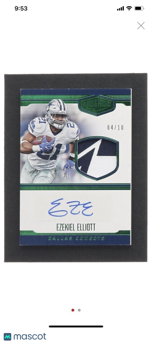 Ezekiel Elliott 2016 Panini Plates and Patches Green RPA 4/10. Cowboys, Buckeyes. Condition is Ungraded. Shipped with USPS Ground Advantage. First-team All-Pro (2016)Second-team All-Pro (2018)3× Pro Bowl (2016, 2018, 2019)PFWA All-Rookie Team (2016)2× NFL rushing yards leader (2016, 2018)CFP national champion (2014)CFP National Championship Offensive MVP (2014)Chicago Tribune Silver Football (2015)Graham–George Offensive Player of the Year (2015)Ameche–Dayne Running Back of the Year (2015)Second-team All-American (2015)First-team All-Big Ten (2015)James E. Sullivan Award (2014) Listed with Mascot.