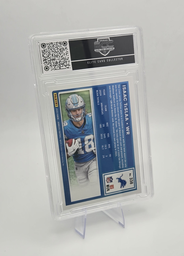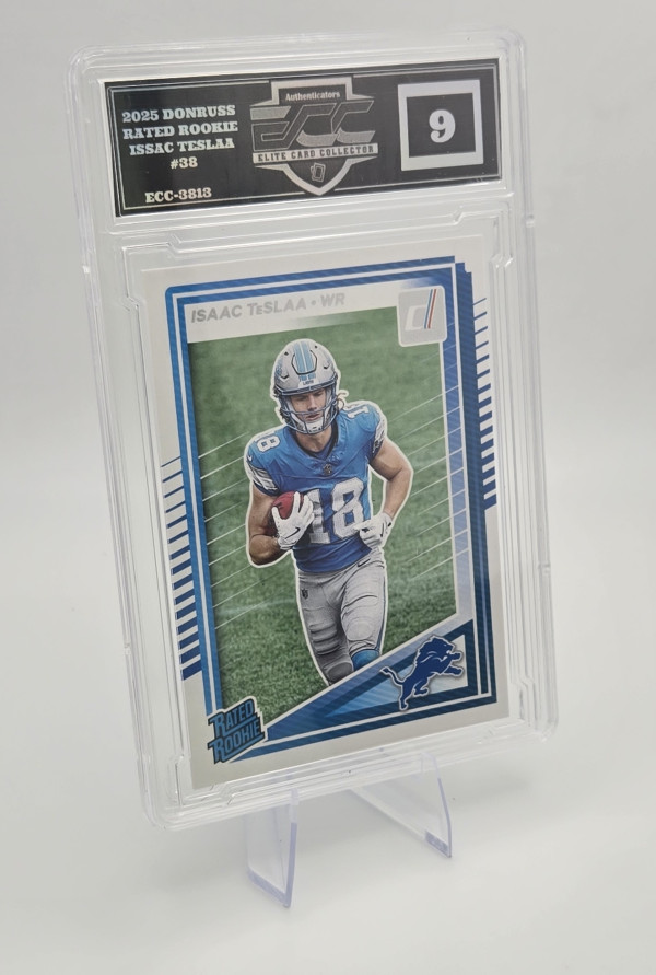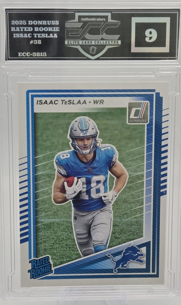 The 2025 Panini Donruss Isaac TeSlaa Rookie trading card is a standard-sized football card featuring the player Isaac Teslaa from the Detroit Lions. Manufactured in 2025, this original card is part of the National Football League (NFL) set and is authenticated by Donruss. Made of 20 Pt. card stock, this Rated Rookie card is a valuable collectible for fans and collectors alike. The card showcases Teslaa as a promising rookie athlete in the 2025 season, making it a sought-after item for sports trading card enthusiasts.