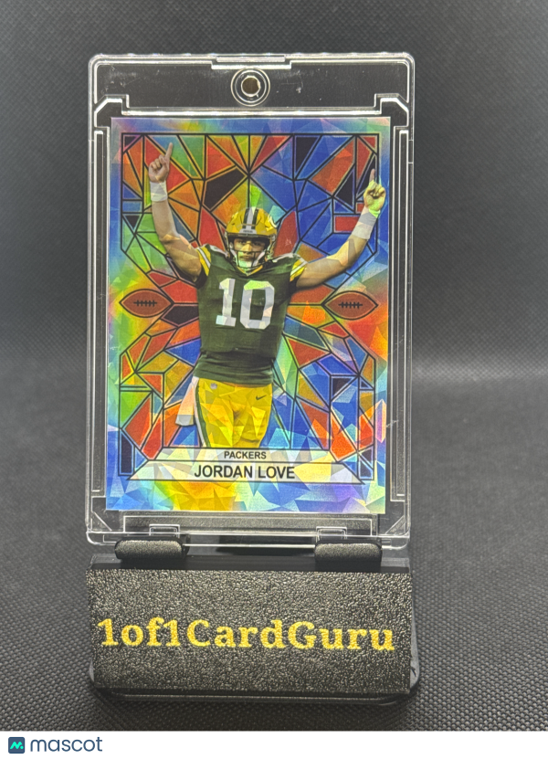 Packers Nation – here’s your chance to grab a stunning custom Jordan Love stained glass card made by 918 Customs! This card explodes with color and detail, giving off a bold, mosaic-style stained glass look that makes it a true standout in any collection.