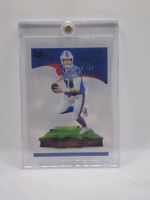 The product is a 2021 Panini Chronicles Stars and Stripes trading card featuring Josh Allen from the Buffalo Bills. This particular card is part of the Magnitude insert set, with a limited print run of only 99 copies. The card is made of standard card stock and has a thickness of 35 Pt. It is an original card manufactured by Panini in the United States for the National Football League (NFL) season of 2021. This collectible item is a valuable addition to any sports trading card collection, especially for fans of football and the Buffalo Bills.