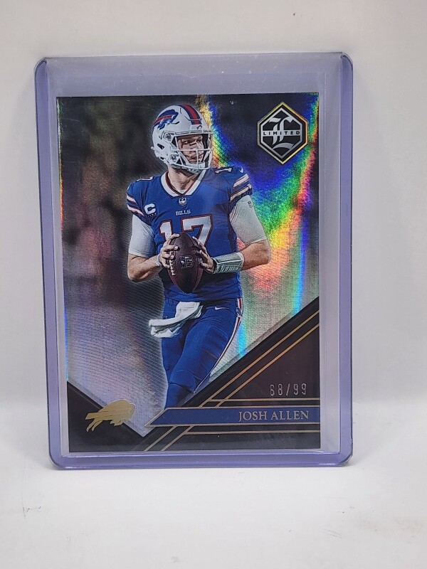 The product is a 2022 Panini Limited trading card featuring Josh Allen of the Buffalo Bills. This card is part of a limited print run of 99 and is made of standard card stock with a thickness of 35 Pt. It is an original card manufactured by Panini and includes special features such as being serial numbered and part of the 2022 Panini Limited set. The card is in English and is a valuable collectible for fans of the National Football League.