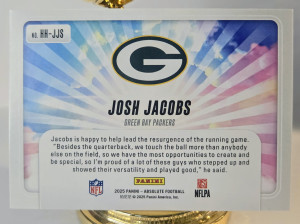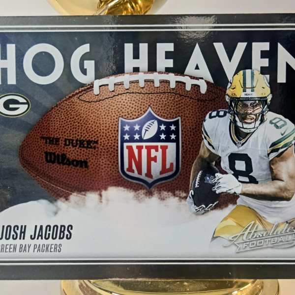 The product is a 2025 Panini Absolute Hog Heaven trading card featuring Josh Jacobs of the Green Bay Packers in the National Football League (NFL). This sports trading card is part of the Hog Heaven insert set, adding a unique element to the card. As a base card with the card number HH-JJS, it is a sought-after collectible for fans and collectors alike.