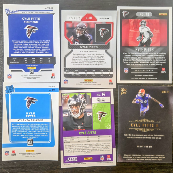The product is a lot of six 2021 football trading cards featuring Kyle Pitts, a player for the Atlanta Falcons and formerly the Florida Gators. The cards are part of various Panini series such as '21 Hyper /175, Red Hyper, WC Premier, Illusions, and The Rookies. Each card is serial numbered, considered a rookie card, and includes parallel and insert features, adding to its collectible value. These cards are perfect for fans of Pitts and collectors of NFL trading cards.