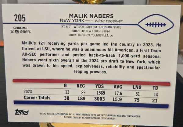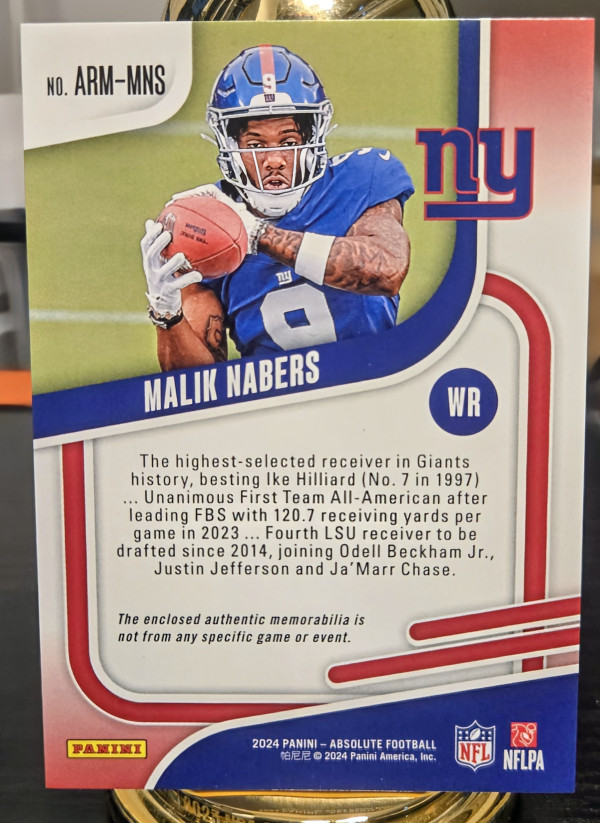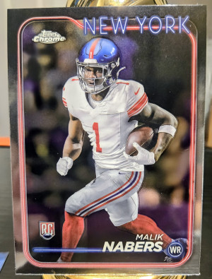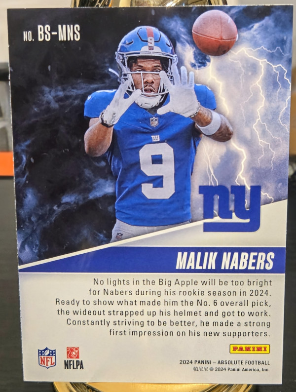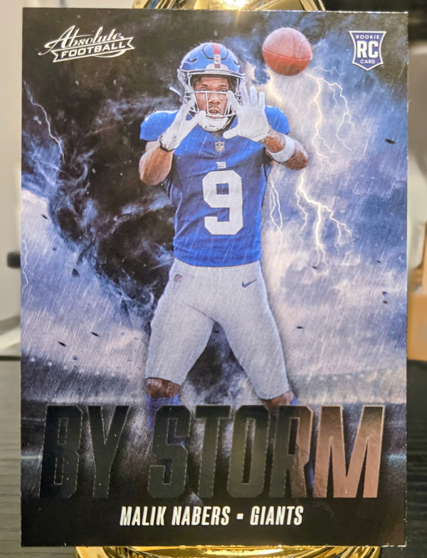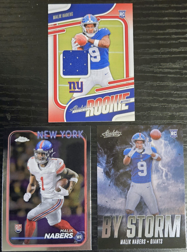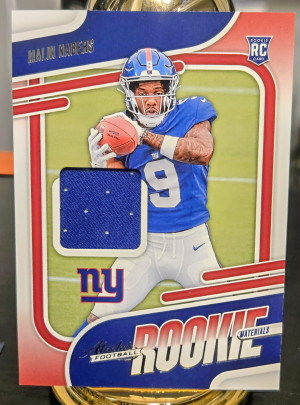 Malik Nabers' '24 Absolute Rookie Materials, '24 Topps Chrome, and '24 By Storm trading cards are a set of three standard-sized sports trading cards featuring the National Football League (NFL) player. Manufactured by Panini in 2024, these original cards are made of card stock and showcase Malik Nabers as a rookie player for the New York Giants. These English-language cards are a valuable addition to any football card collection and are sure to be sought after by fans and collectors alike.