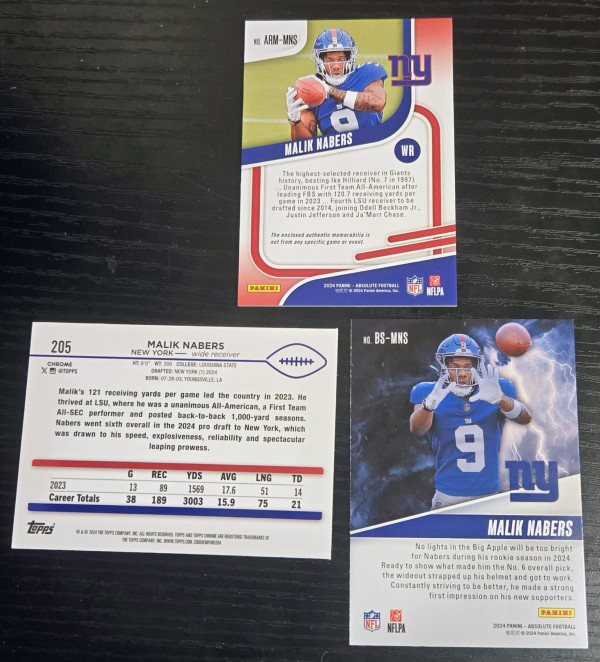 2024 Panini Absolute Football Rookie Materials #ARM-MNS, 2024 Topps Chrome RC #205, & 2024 Panini Absolute Football By Storm #BS-MNS