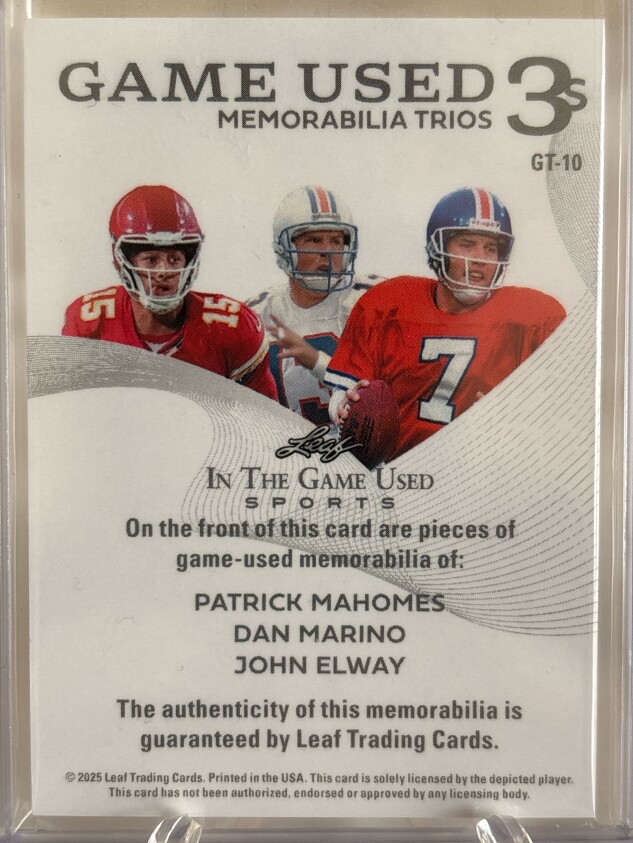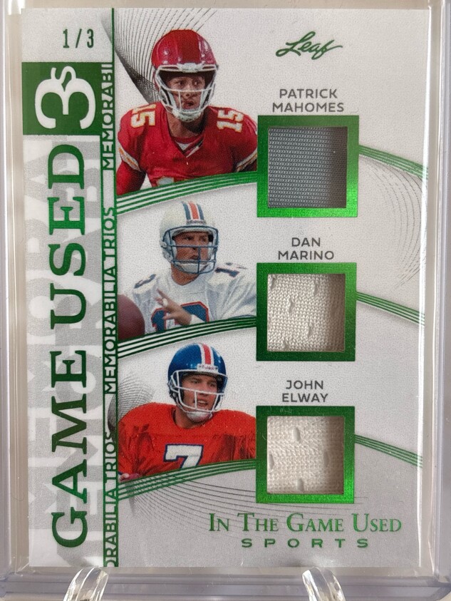 Patrick Mahomes / Dan Marino / John Elway 2025 Leaf In The Game Used - Game Used Memorabilia Trios Green Holo 1/3
