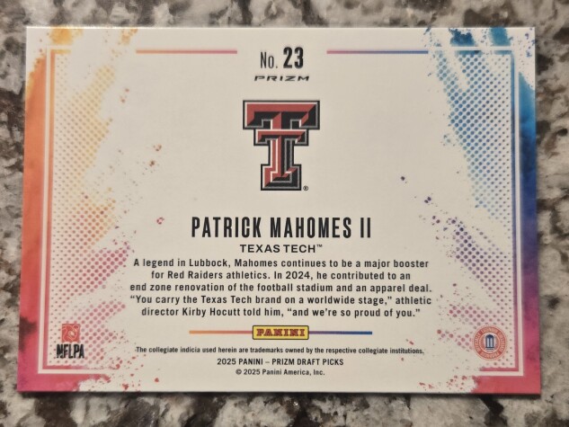 Capture the essence of gridiron glory with this Patrick Mahomes II 2025 Prizm Draft Picks Black Color Blast Case Hit SSP card. A standout collectible featuring one of football's most dynamic talents, this card is a must-have for fans and collectors alike. Its eye-catching Prizm parallel and rare Black Color Blast make it a striking addition to any collection.Crafted by Panini, the trusted name in sports memorabilia, this card celebrates Mahomes' impressive career and is a symbol of his potential on the field. Whether you're looking to invest in a piece of sports history or simply want to own a piece of the action, this card represents the perfect blend of art and athleticism.