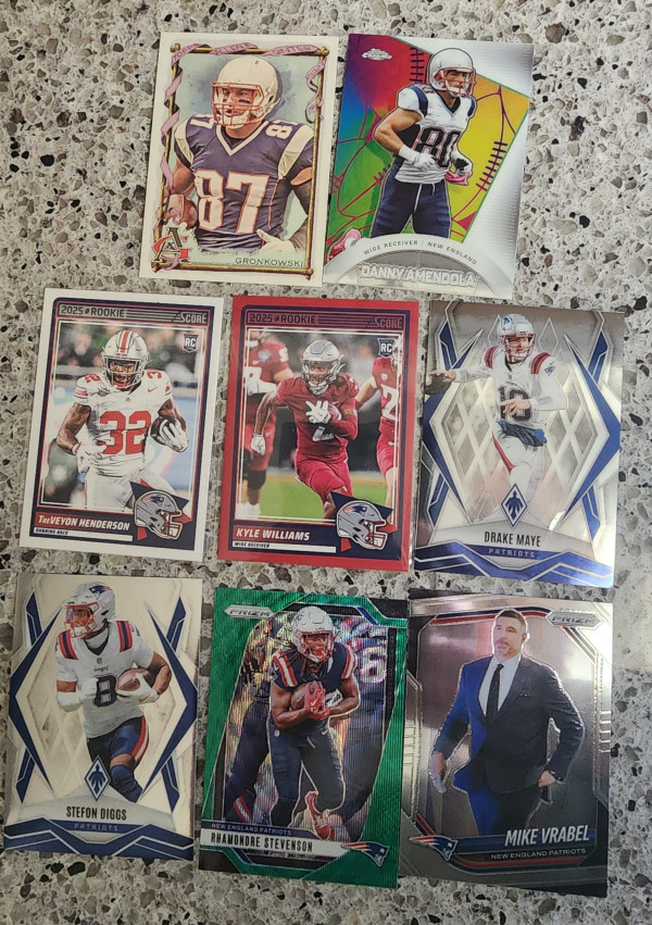 This is a 46 card team lot for the upcoming Superbowl contender New England Patriots. This includes many Drake Maye cards. Past stars like Gronkowski. Rookie cards for all the 2025 stars Treyvon Henderson, Kyle Williams and more. Brands include Topps and most of the Panini types. Donruss, Mosaic, Phoenix, Absolute, Elite, Score & more. Let me know if you have any questions.