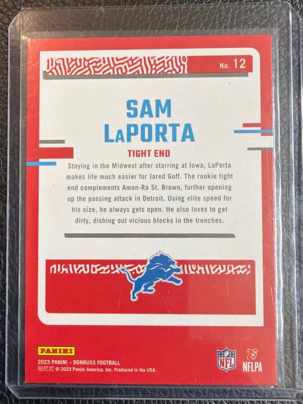 Slick Donruss “The Rookies” card of Sam LaPorta, one of the top young tight ends in the league. Nice holo shine, sharp image, and great Lions color match—perfect for PC or resale.