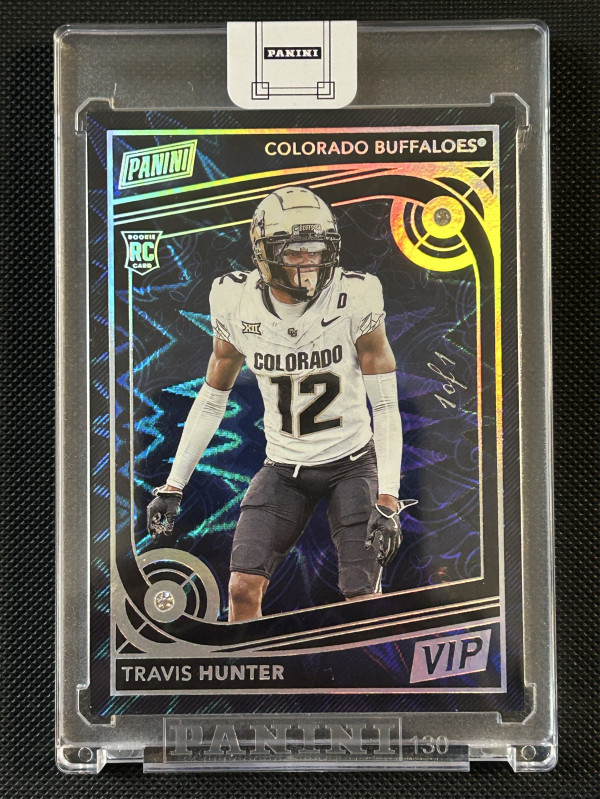 The product is a highly sought-after Travis Hunter 2024 The National VIP Sealed Gem Dual Diamond 1/1 #TH RC trading card. Manufactured by Panini in 2025, this original sports trading card features a unique design with a diamond parallel variety, making it a rare collectible for football fans. The card showcases features such as being serial numbered, a one-of-a-kind hologram, and a short print design, all adding to its value and appeal to collectors. With only a limited print run of 1, this card is a special addition to any sports trading card collection.