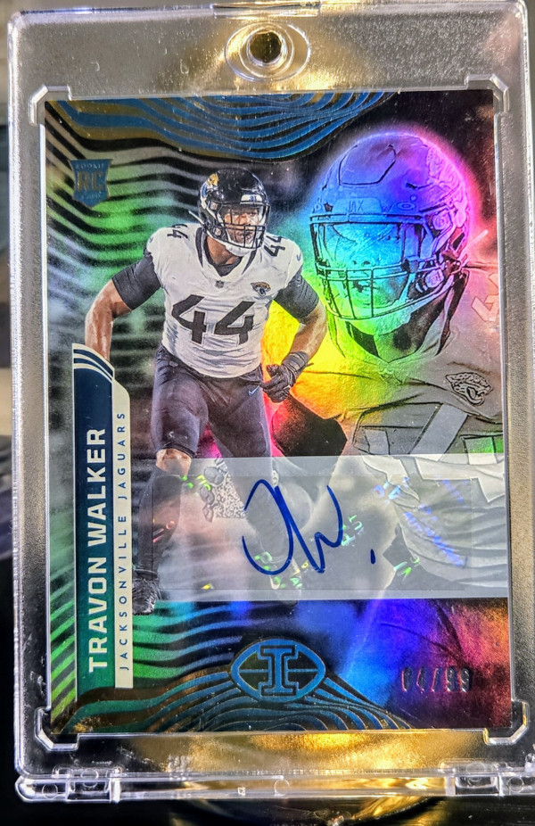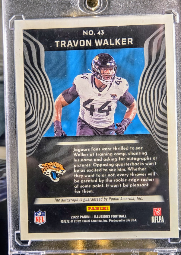 Elevate your collection with the Travon Walker 2022 Panini Illusions Rookie Autograph card, numbered 04/99. As a featured piece from the Illusions Trophy Collection Signatures series, this card is a must-have for fans and collectors alike. Showcasing the Jacksonville Jaguars' rising talent, this serial numbered card is part of a limited print run, making it a rare and valuable addition.