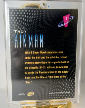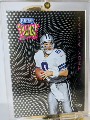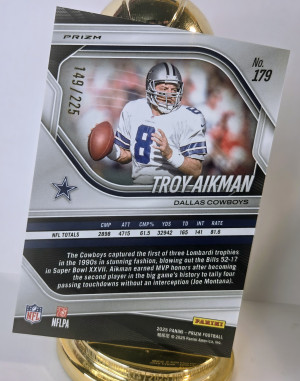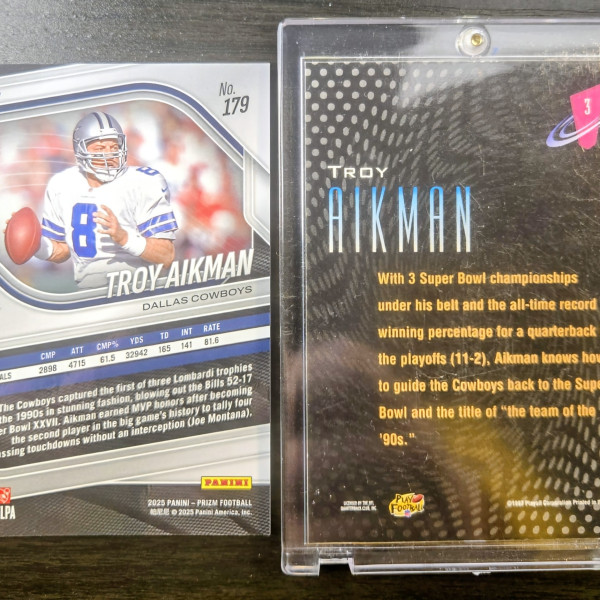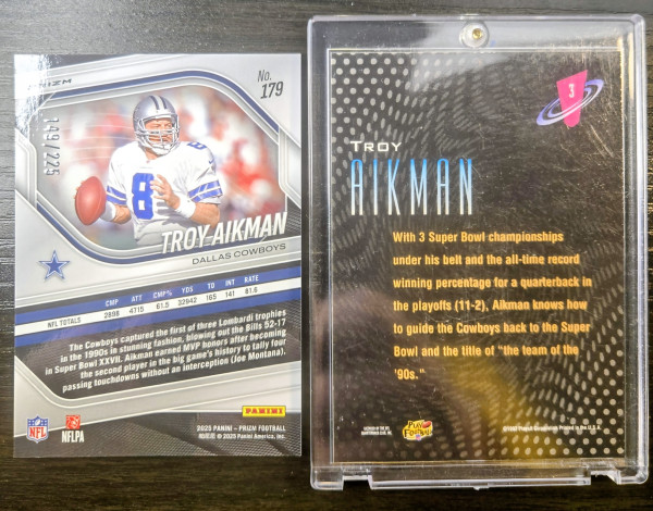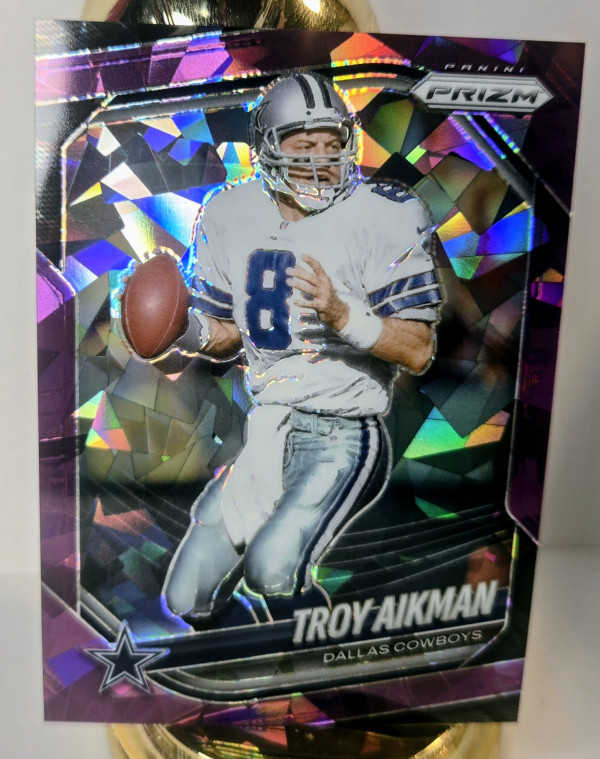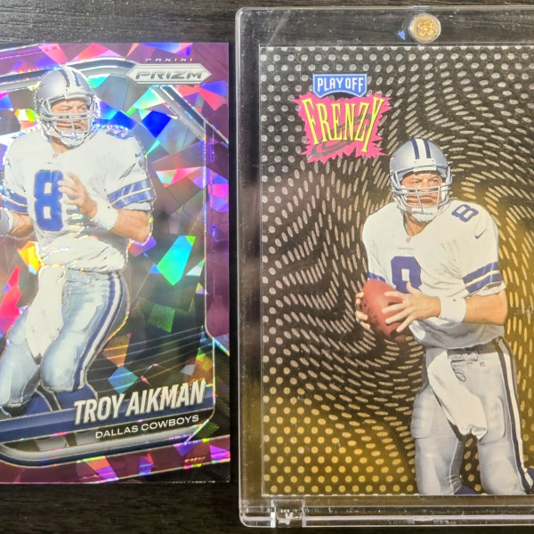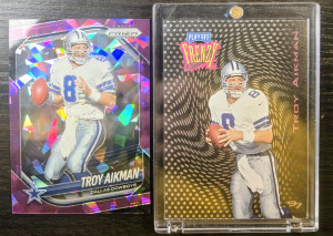 The product is a set of two sports trading cards featuring football player Troy Aikman from the Dallas Cowboys. One card is a 2025 Panini Prizm Purple Ice parallel numbered to /225, while the other is a 1997 Playoff Frenzy card. Both cards are part of the National Football League (NFL) trading card collection and are highly collectible items for fans of the sport and the player alike. Ideal for collectors looking to add unique and limited edition cards to their collection.