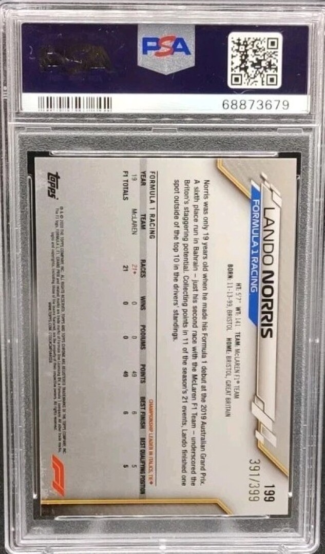 The product is a 2020 Topps Chrome Formula 1 Purple Refractor Lando Norris Rookie Card graded as a PSA 9. This single-parallel card features Lando Norris from the McLaren Formula 1 Team, with a print run of 399. It is a part of the original 2020 Topps Chrome Formula 1 set and is serial-numbered, making it a valuable addition to any sports trading card collection for fans of auto racing and Formula 1.