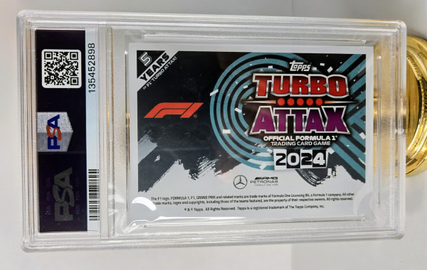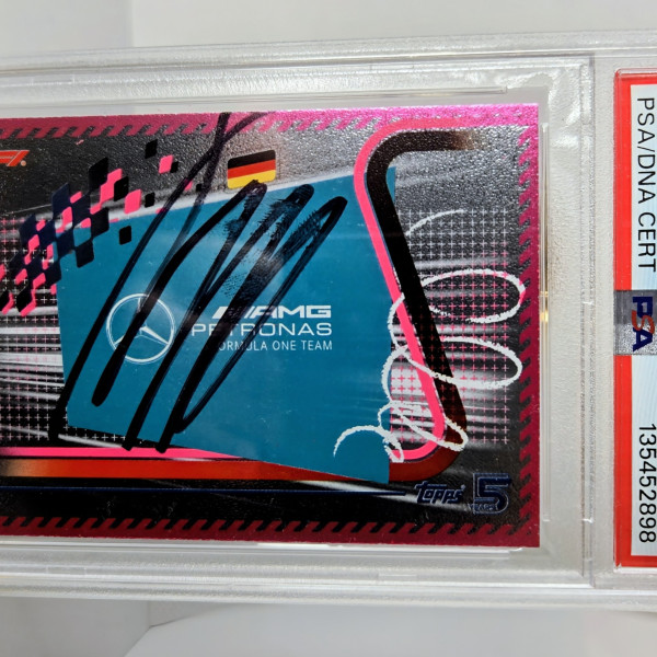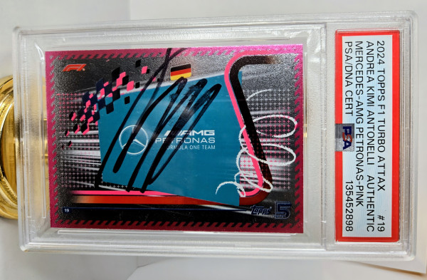 The product is a 2024 Topps F1 Turbo Attax trading card featuring an autograph from Formula 1 driver Andrea Kimi Antonelli of the Mercedes-AMG Petronas team. The autograph is hard-signed and authenticated by Professional Sports Authenticator (PSA). This rare pink parallel variety card is a valuable collectible for fans of auto racing and trading card enthusiasts.