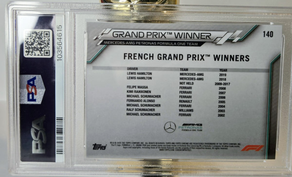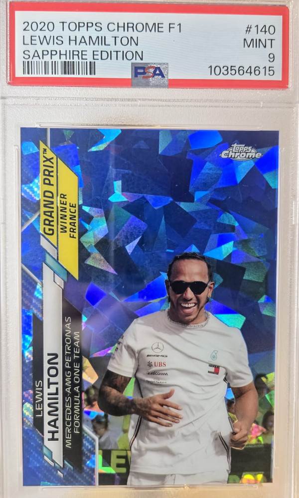 The product is a 2020 Topps Chrome Sapphire Edition Formula 1 trading card featuring Lewis Hamilton, a prominent driver in the Mercedes-AMG Petronas team. This specific card is numbered #140 and is part of the base set, making it a valuable collectible for fans of auto racing and Formula 1. Produced by Topps, this sports trading card captures Hamilton's achievement as the 2020 GP winner, adding to its appeal and desirability among collectors.