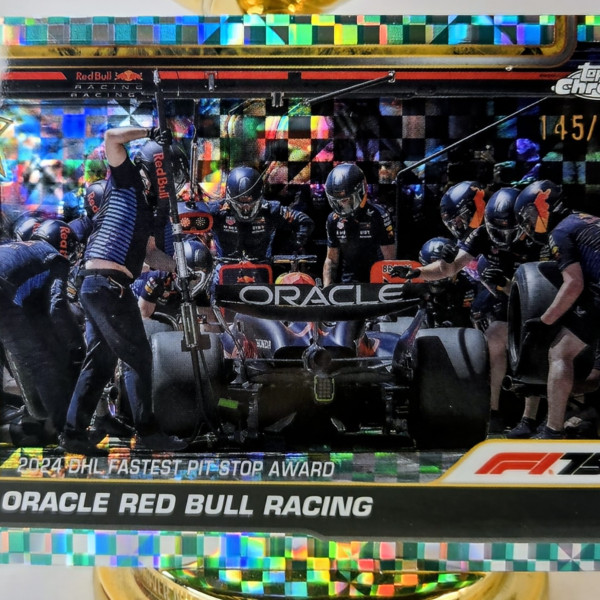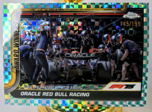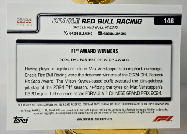 The product is a 2025 Topps Chrome Formula 1 trading card featuring Oracle Red Bull Racing, specifically card number 146. This particular card is a limited edition Aqua Checkered Flag parallel with a print run of 199. It is a collectible item for fans of Formula 1 auto racing and is likely to be sought after by collectors looking to add rare and unique pieces to their collection.