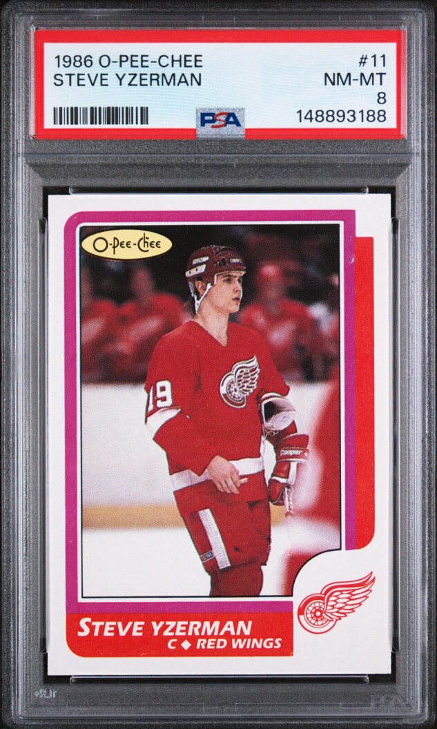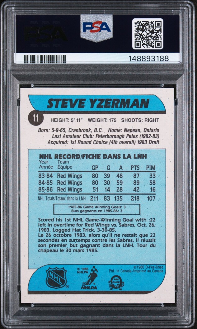 1986 O-Pee-Chee OPC STEVE YZERMAN Rare HOF Hockey Card #11 - GRADED PSA 8 - Detroit Red Wings - PERFECT CENTERING - UNDERGRADED