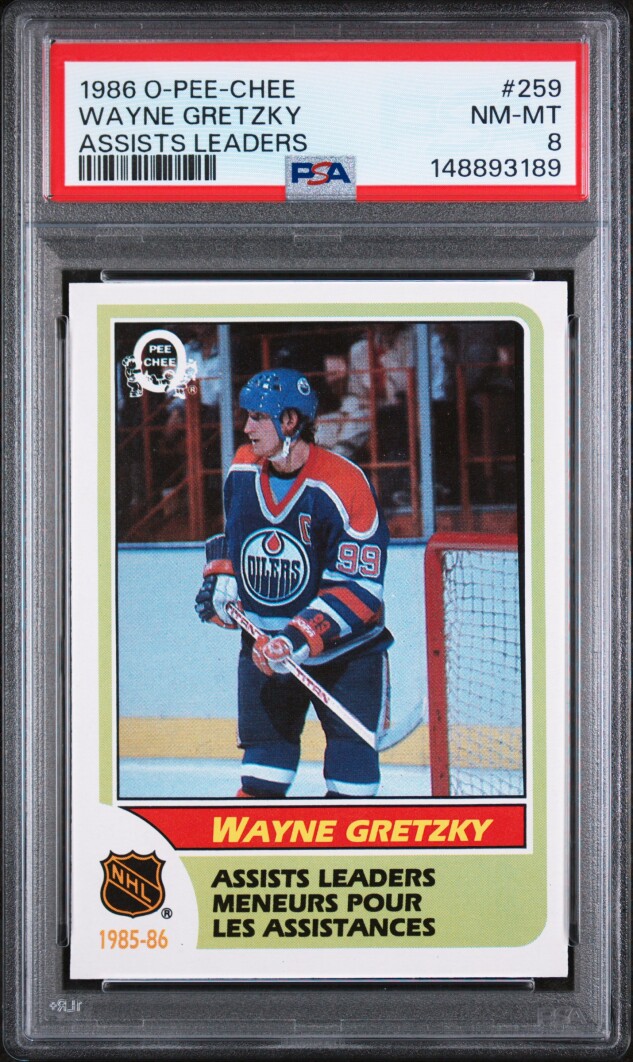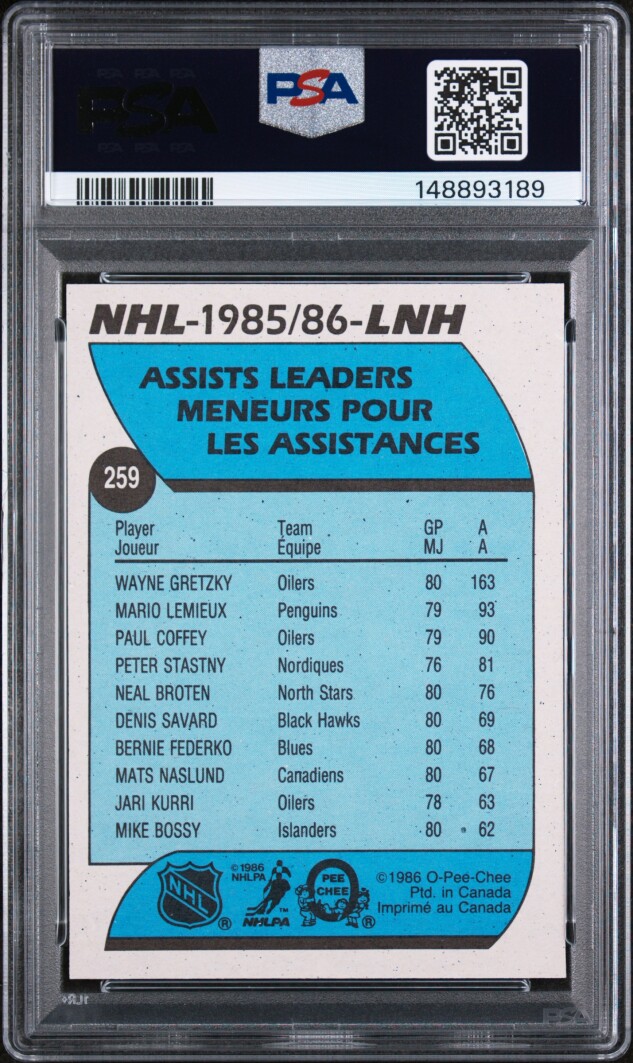 1986 O-Pee-Chee OPC WAYNE GRETZKY Rare ASSISTS LEADERS #259 HOF - GRADED PSA 8 - Edmonton Oilers