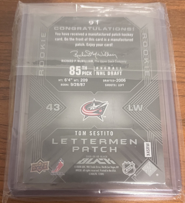 2008-09 Upper Deck UD Black Rookie Lettermen /399 Tom Sestito #91 Columbus Blue Jackets Letter "T". While I will consider trades, I am more interested in selling. PLEASE look at my profile because what I will accept in trade is very specific. If you offer me in trade something that is not listed in my profile, I will not reply. Thank you for looking.