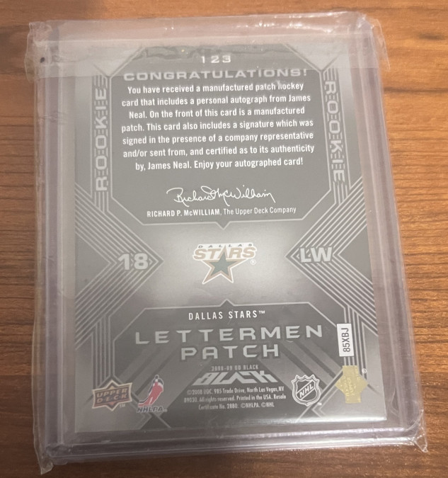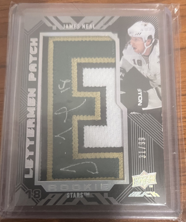 2008-09 Upper Deck UD Black Rookie Lettermen /99 James Neal #123 AUTO Dallas Stars Letter "E". While I will consider trades, I am more interested in selling. PLEASE look at my profile because what I will accept in trade is very specific. If you offer me in trade something that is not listed in my profile, I will not reply. Thank you for looking.