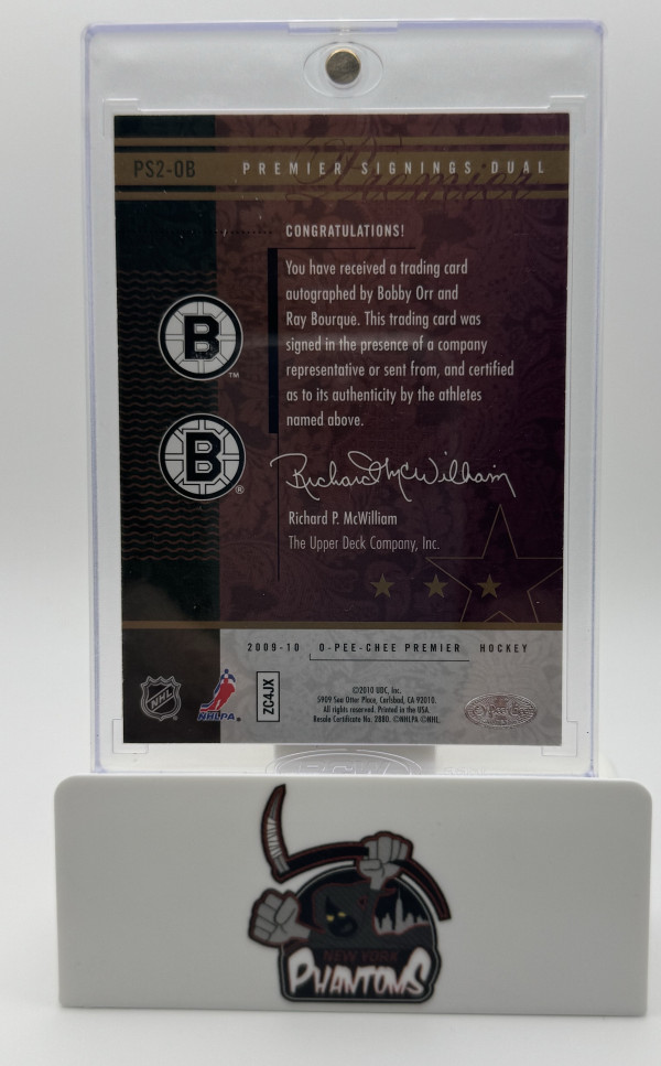 Beautiful on card dual auto of Bobby Orr and Ray Bourque /25 from 2009-10 O-Pee-Chee Premier
