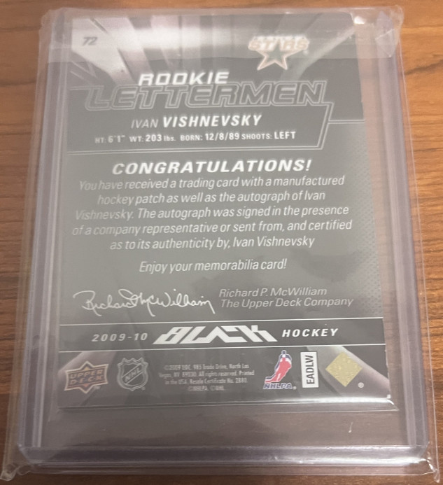 2009-10 Upper Deck UD Black Rookie Lettermen /499 Ivan Vishnevskiy Vishnevsky #72 AUTO Dallas Stars Letter "N". While I will consider trades, I am more interested in selling. PLEASE look at my profile because what I will accept in trade is very specific. If you offer me in trade something that is not listed in my profile, I will not reply. Thank you for looking.