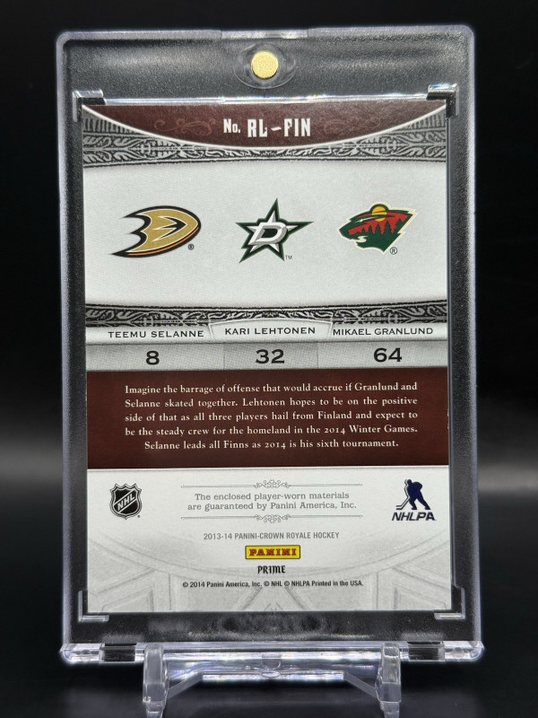 You are purchasing a 2013-14 Panini Crown Royale Kari Lehtonen Teemu Selanne Mikael Granlund #RL-FIN Prime Parallel/Variety Rookie Memorabilia Insert. You will receive the exact item in the photographs. Thank you for looking.