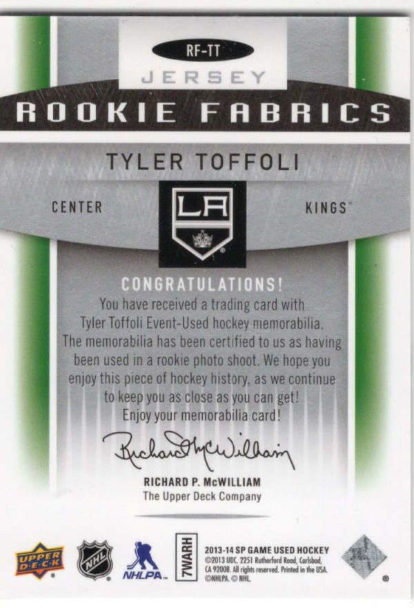 You are purchasing a 2013-14 Upper Deck SP Game Used Tyler Toffoli #RF-TT Rookie Jersey. You will receive the exact item in the photographs. Thank you for looking.