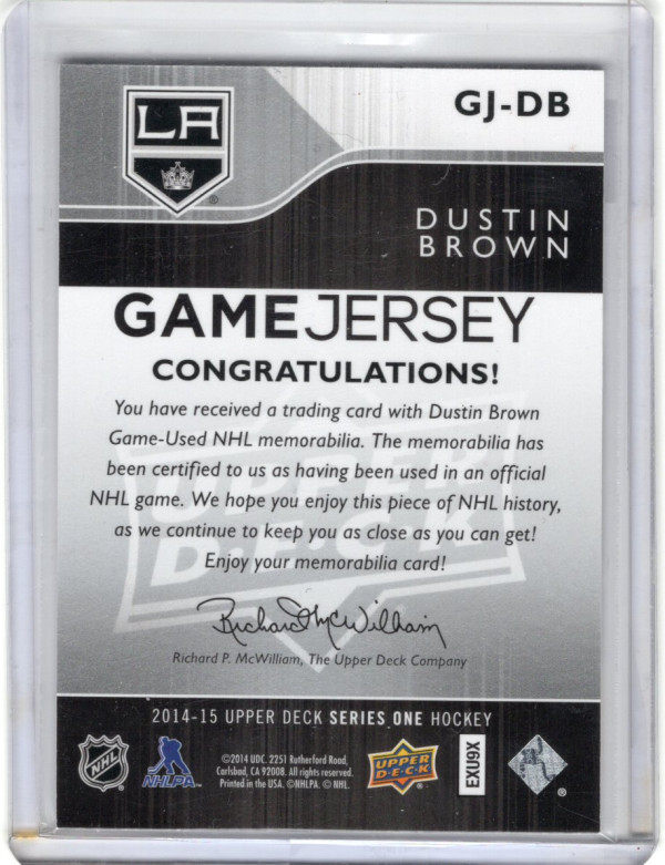 You are purchasing a 2014-15 Upper Deck Series One Hockey Dustin Brown #GJ-DB Game-Used Jersey. You will receive the exact item in the photographs. Thank you for looking.